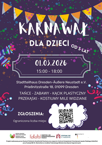 Serdecznie zapraszamy dzieci w wieku od 5 lat na zabawę karnawałową do Stadtteilhaus Äußere Neustadt!